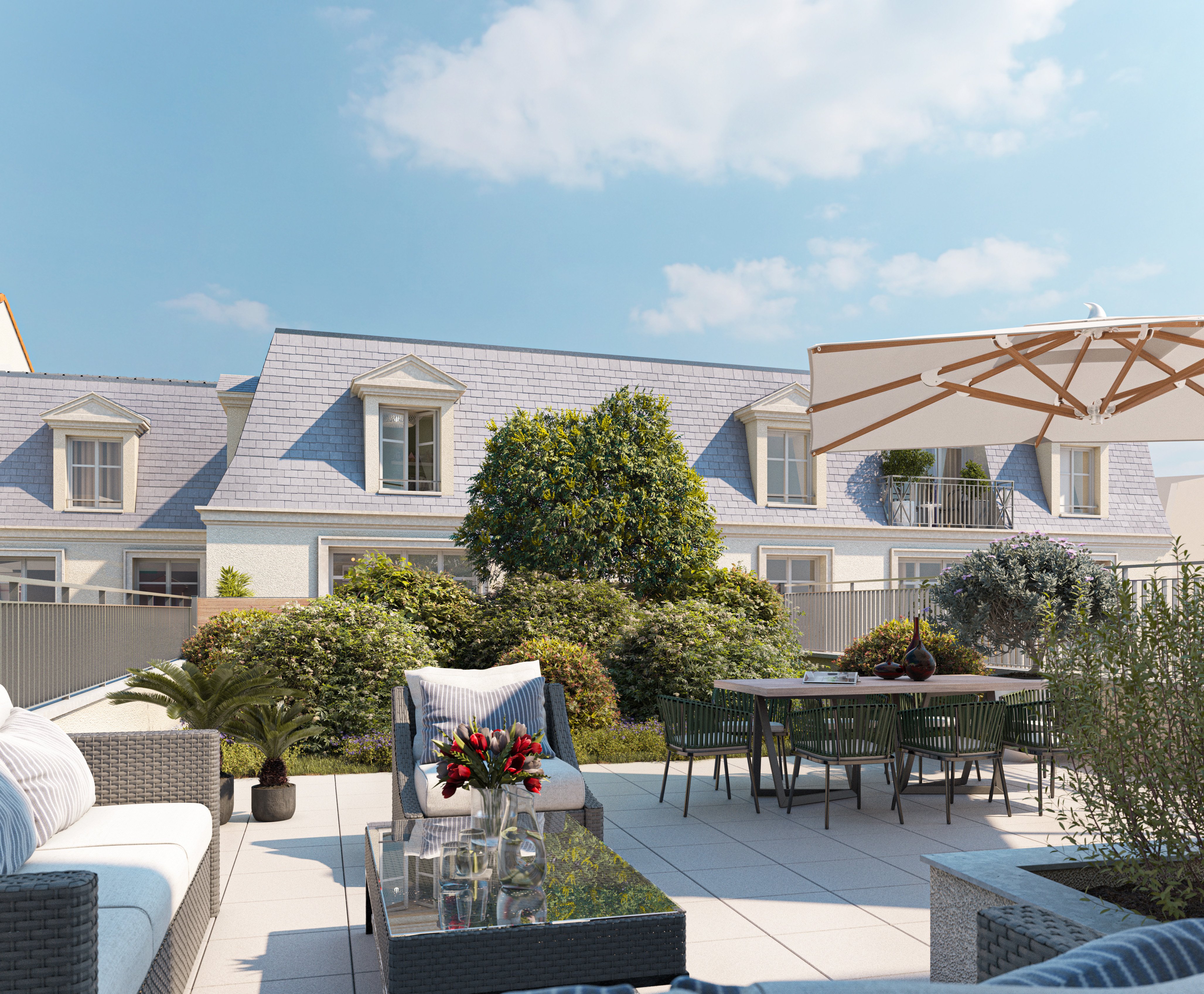 Revêtement de sol en parquet massif Menuiseries extérieures et tablier du volet roulant électrique en aluminium Chauffage et eau chaude sanitaire assurés par une pompe à chaleur 100% électrique Cœur d’ilot végétalisé et terrasses plantées, conçus par un paysagiste.