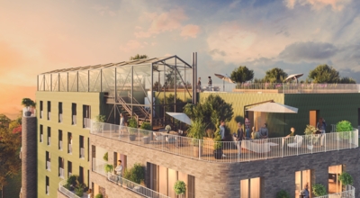 L'environnement est un enjeu majeur de notre projet : nous visons le label biosourcé avec les menuiseries extérieures bois, platelage bois terrasses, parquet massif... et une serre sur le toit. Des espaces paysagers et terrasse collective sont également prévus.