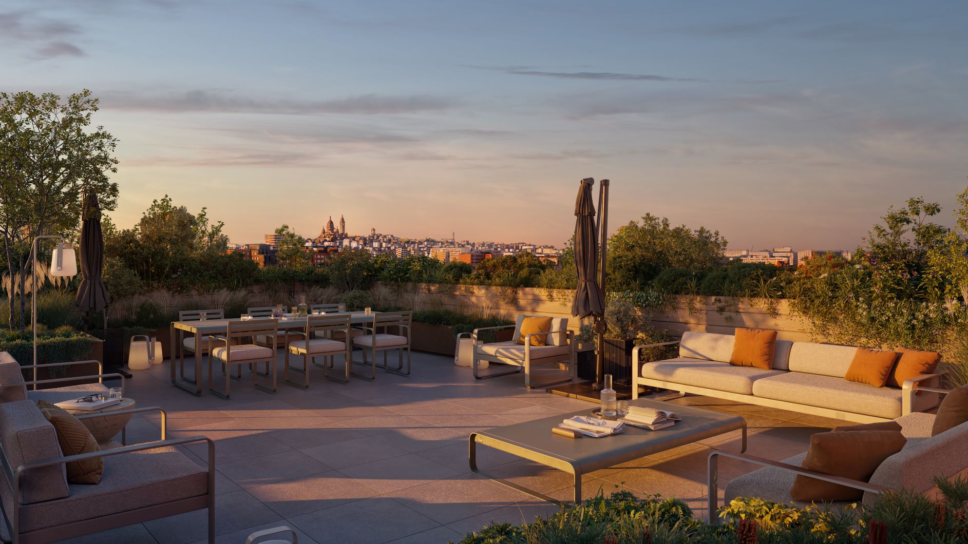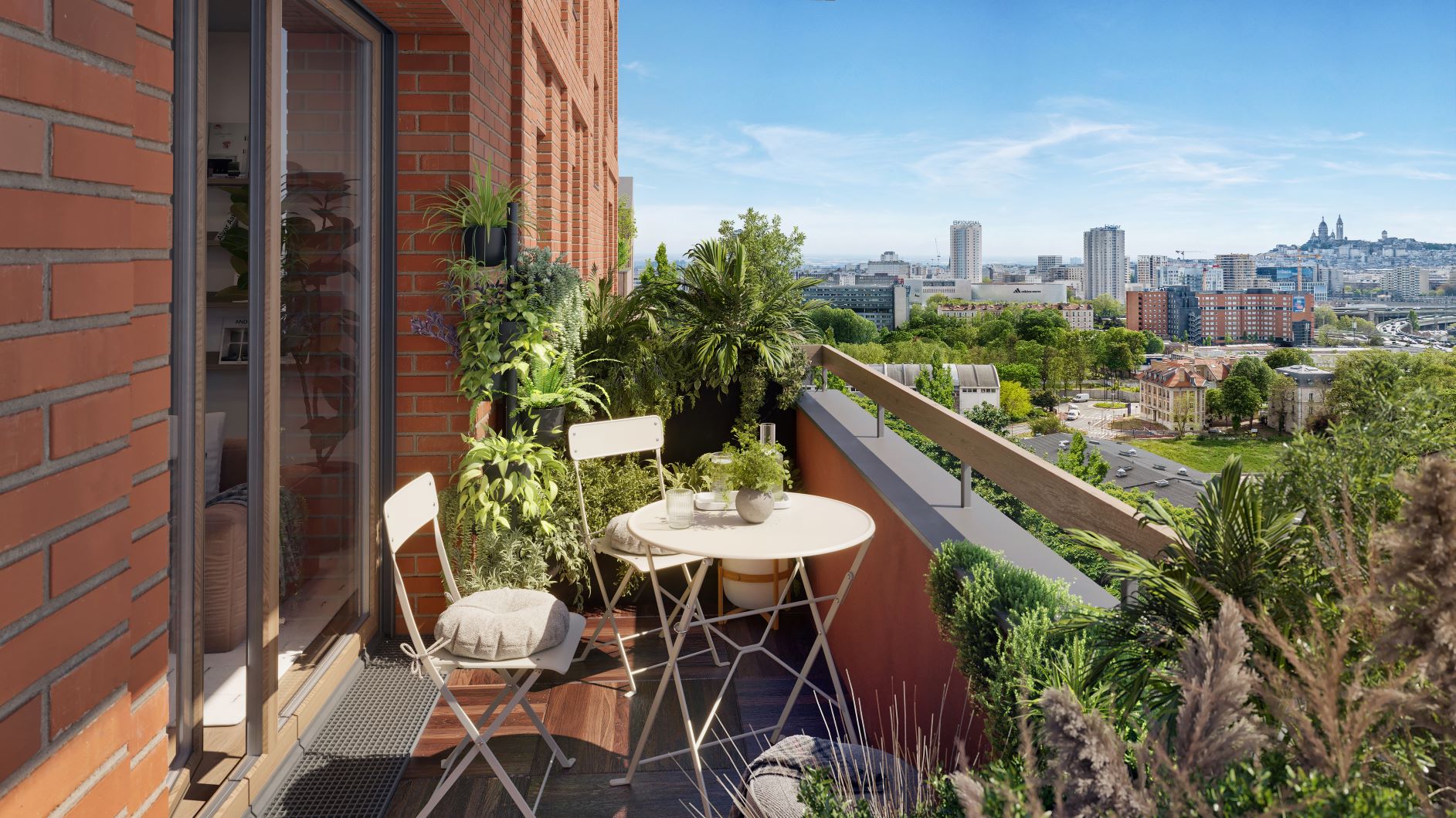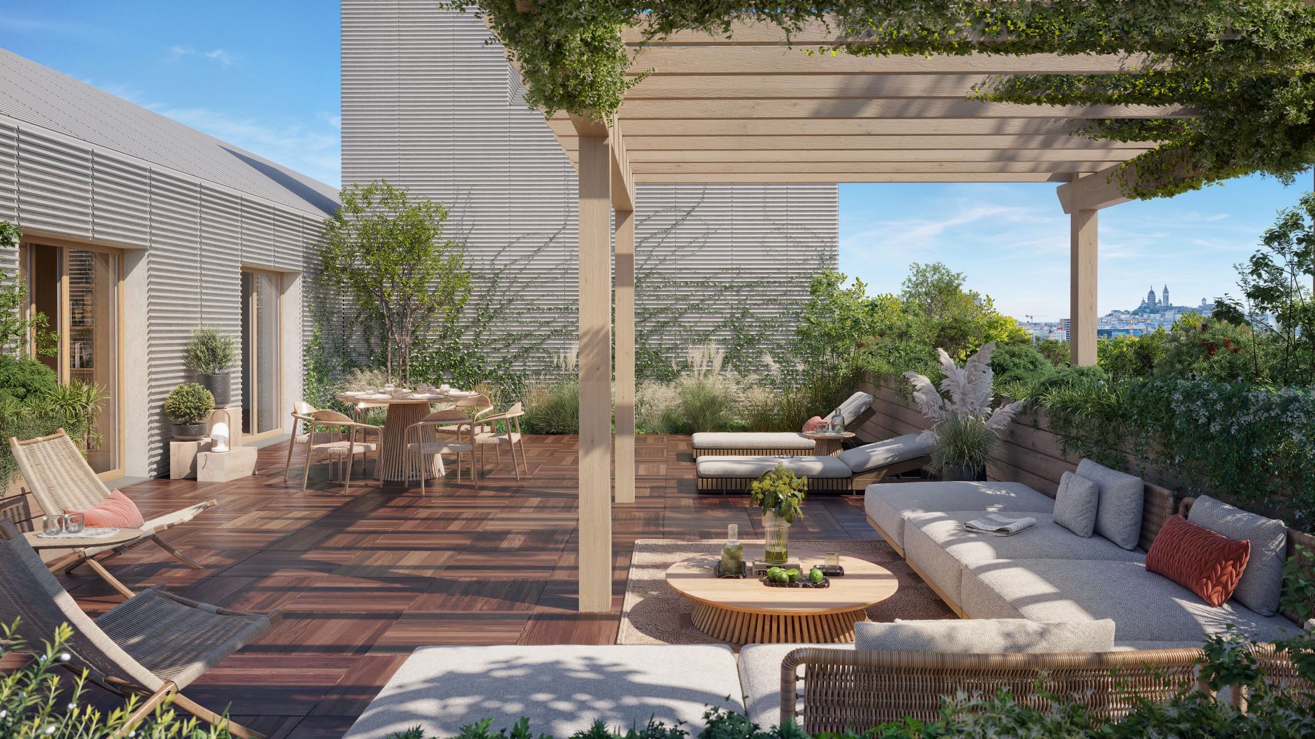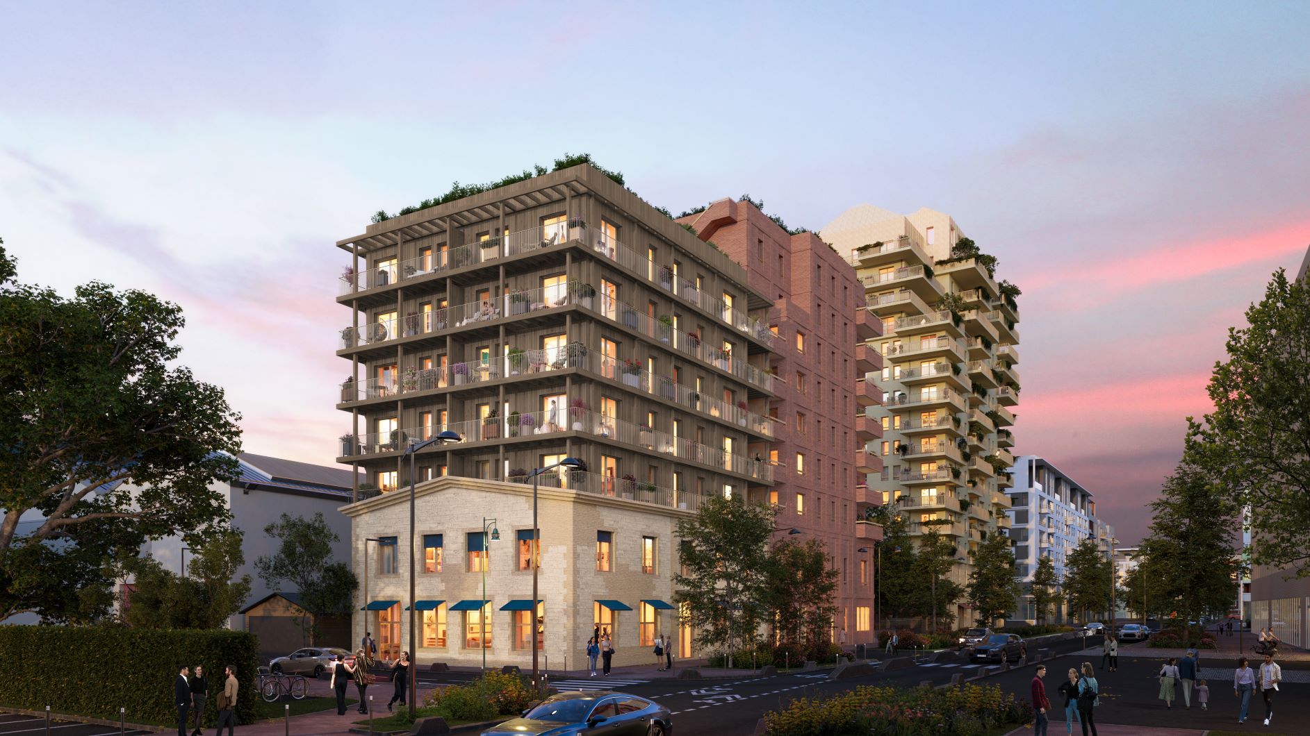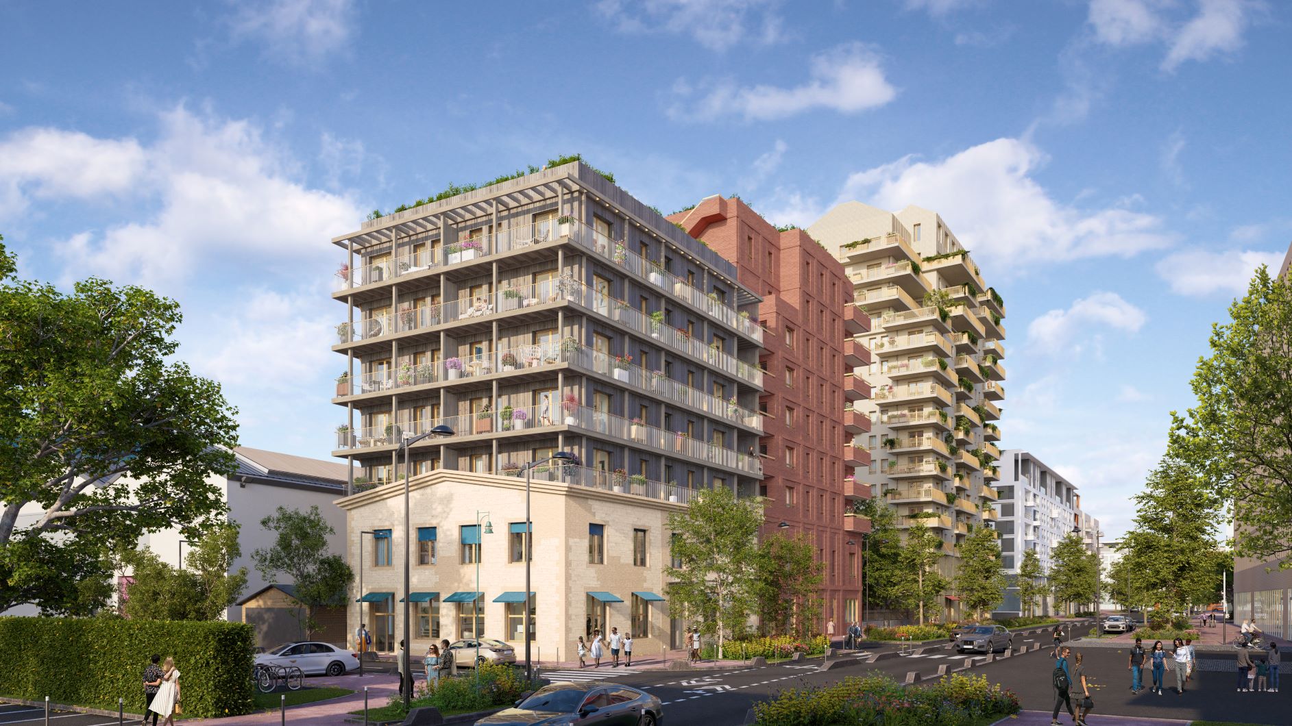 Situé au carrefour de la rue Proudhon et de la rue des Céréales, TIME vient parachever la métamorphose urbaine du quartier Front Populaire. Les 32 logements BRS sont répartis sur cinq niveaux au sein de bâtiments accueillant en rez-de-chaussée un centre médical semble à une maison. Sur l’un des bâtiments, aux deux premiers niveaux en plaquettes de briques et pierre collée succèdent des façades habillées de bois (structure et bardage), faisant écho au cœur d’îlot densément végétalisé. Sur l’autre bâtiment, des plaquettes de brique de teinte rouge seront déployées sur toute la façade et apporteront une touche chaleureuse supplémentaire. HARMONIE ENTRE NATURE ET ARCHITECTURE À compter du 7e étage, le projet livre à ses résidents la faveur de vues en balcon sur Paris et sur le Sacré-Cœur en toile de fond. L’œil est aussi naturellement attiré par le dernier étage semblable à un jardin suspendu. Celui-ci offre son intimité à une terrasse privative, ainsi qu’à une terrasse partagée toutes les 2 très bien exposées et livrant de belles perspectives. Donnant l’impulsion à la ville exemplaire de demain, cette réalisation porte des ambitions environnementales élevées. S’inscrivant dans une démarche vertueuse et écologique d’utilisation de la matière, TIME valorise l’économie circulaire et le réemploi : parcours piéton en bois côté jardin, terre végétale, dallage, mobilier urbain…
